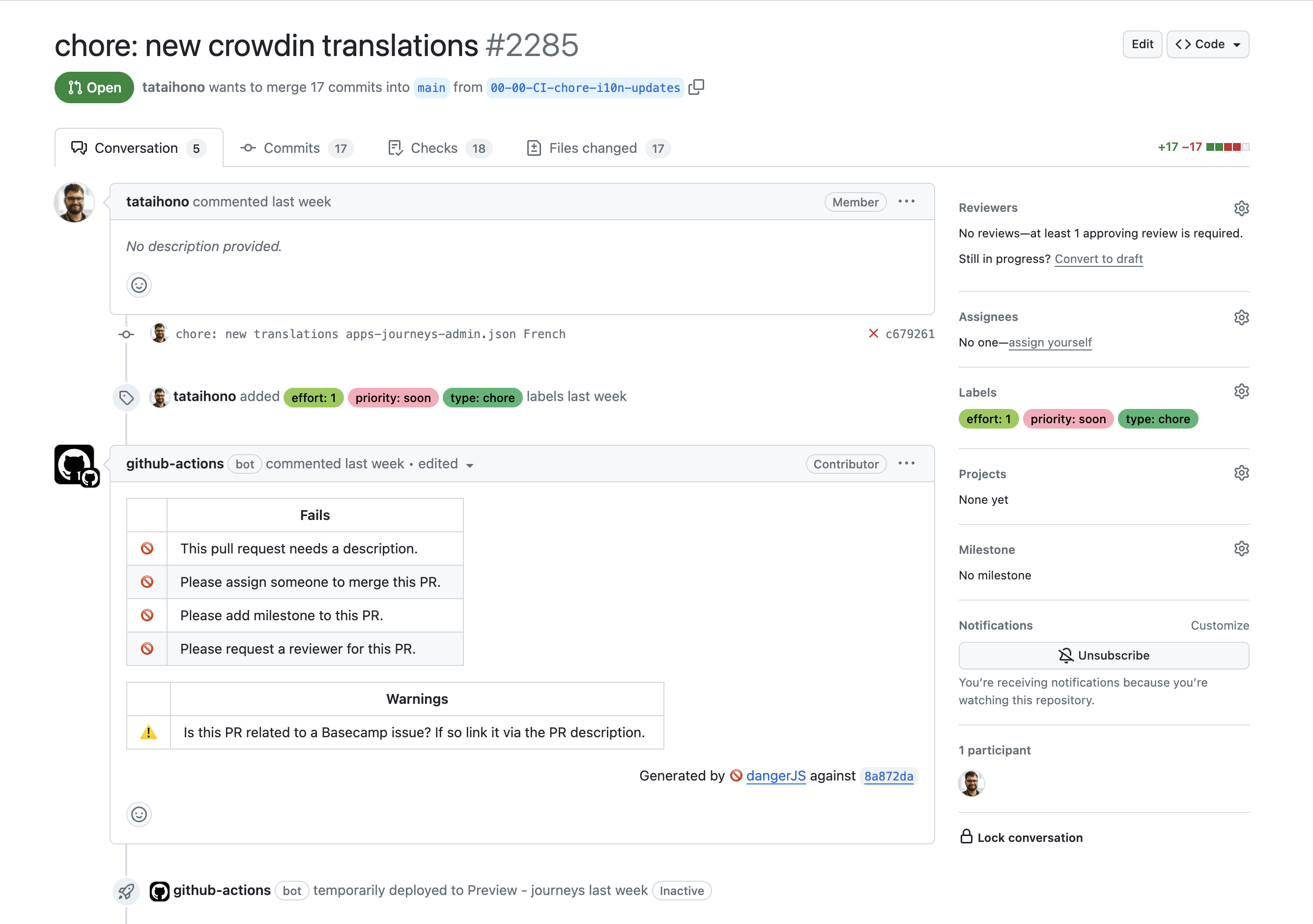 - Crowdin automatically creates a GitHub PR with new translations (view open Crowdin PRs)